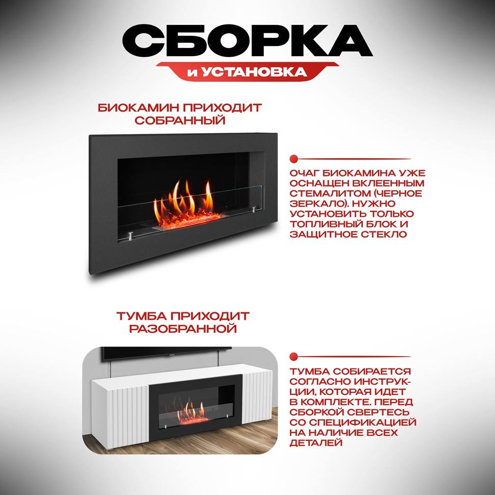 Тумба под телевизор SteelHeat LIVORNO IMPULSE 140 см в белом корпусе с белыми фасадами объединяет стильный дизайн и современные технологии, являясь функциональным украшением дома, которое создает теплую и уютную атмосферу. Изготовленная из качественного МДФ и ЛДСП с прочной отделкой, тумба отличается долговечностью и безопасностью. Встроенный биокамин, декоративный источник тепла с эффектом живого огня (линия огня 250 мм), оснащен термоизоляцией, топливным блоком пониженной мощности, защитой от пролива топлива (поддон) и конструктивной изоляцией от корпуса тумбы и стен. Элегантный дизайн с серым корпусом и фасадами гротто гранит делает тумбу универсальной. Ее компактные габариты позволяют установку даже в ограниченном пространстве, в том числе напольно. Биокамин работает до 1,15 часа на одной заправке (объем бака 0,75 л) с экономичным средним расходом топлива 0,2 л/ч, сочетая эстетику настоящего пламени с практичностью и безопасностью.